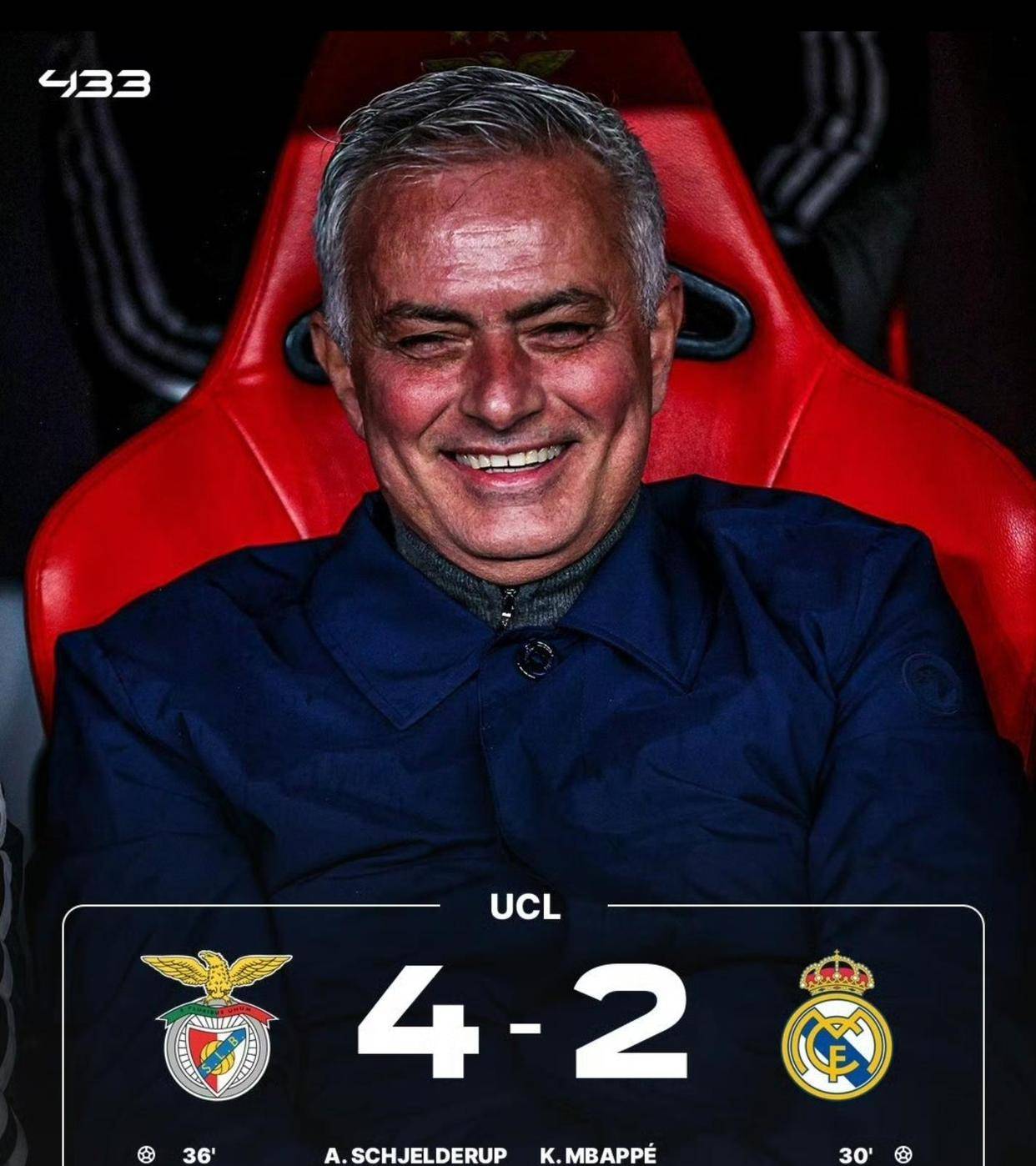比赛开局看似按皇马的剧本走。 第30分钟,劳尔·阿森西奥右路传中,姆巴佩头球破门,一切顺理成章。 但皇马球迷的欢呼声还没落下,6分钟后本菲卡就扳平了比分。