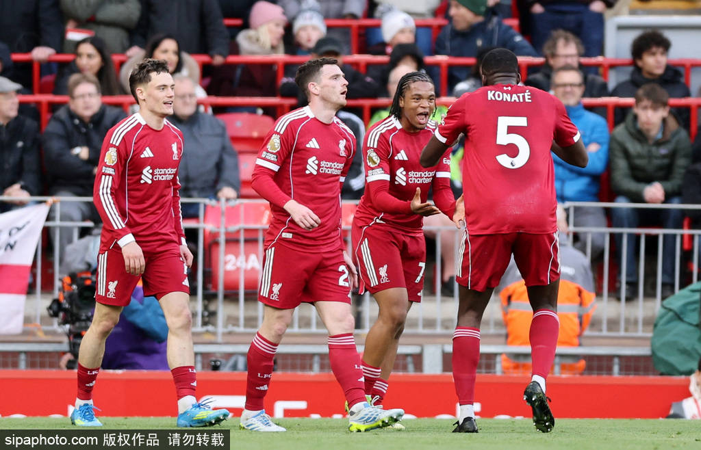 第36分钟,利物浦取得领先,维尔茨传球,恩古莫哈禁区左肋兜射远角破门,1-0!这是恩古莫哈本赛季第2球,同时他以17岁零225天的年龄,打破斯特林的纪录,成为在安菲尔德球场进球最年轻的利物浦球员。
